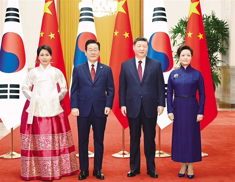 会谈前,习近平和夫人彭丽媛在人民大会堂北大厅为李在明和夫人金惠景举行欢迎仪式。