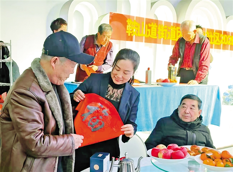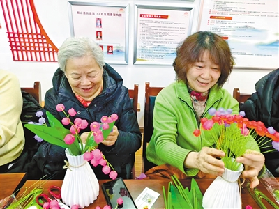 活动中,书法志愿者们凝神挥毫,一幅幅笔力遒劲的对联、一个个喜庆吉祥的福字跃然纸上,刚一落笔就被居民们争相领取,墨香氤氲间,充满邻里同乐的温暖。手工制作区同样热闹非凡,志愿者现场指导扭扭棒花束制作,居民们兴致勃勃围坐一团,相互交流技巧,巧手翻飞间,一枝枝独具匠心的花束次第成型,寄托着大家对幸福生活的赞美。