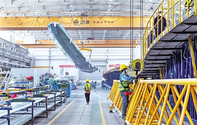 1月6日,在位于乌兰察布市察哈尔高新技术开发区的远景蒙新集团乌兰察布叶片生产基地,一片繁忙的生产景象。新年伊始,该基地的6条叶片生产线24小时满负荷运转,平均每天就有4至5支巨型叶片下线。据了解,该基地目前已具备年产1500支大兆瓦级风电叶片能力。 本报记者 王磊 摄