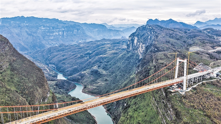1月6日拍摄的主体工程已完工的安盘高速天门特大桥(无人机照片)。近日,贵州安(安顺)盘(盘州)高速天门特大桥主体工程顺利完工。天门特大桥是安顺至盘州高速公路的重要控制性工程,大桥全长1553米,桥面距离峡谷水面约560米。 新华社记者 陶亮 摄