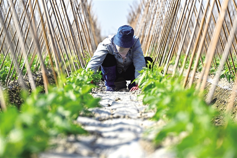 1月8日,农民在海南省澄迈县瑞溪镇罗浮洋蔬菜种植基地管护豇豆苗。近日,海南进入冬季瓜菜种植和采收的旺季,田间地头都是农民劳作的身影。据了解,2025至2026年度,海南冬季瓜菜计划种植面积290万亩,预计产量500万吨,将供应全国170多个大中城市。