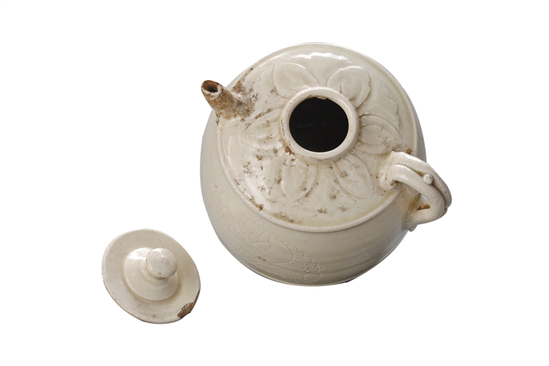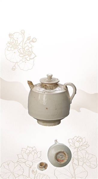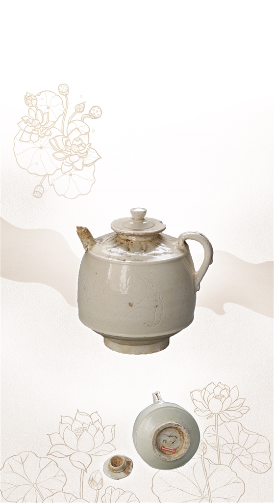 该馆藏品部副主任塔娜介绍:“这件瓷注出土于丰镇市九墩沟墓葬,圆唇、内敛小口,配有圆钮盖,短流与单把设计精巧,折肩,器身压莲瓣,直鼓腹与假圈足的搭配增加了器型的稳重感。”