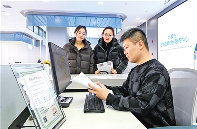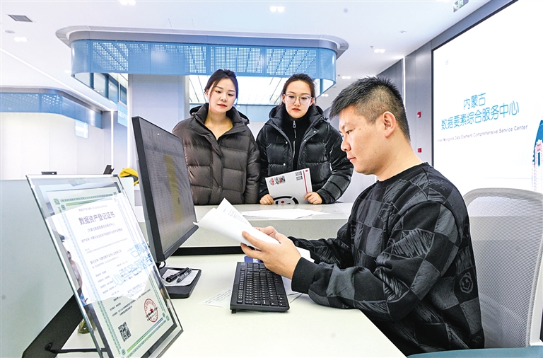 1月9日,在内蒙古数据要素服务中心办事大厅内,工作人员正在为企业办理数据资产登记证书。据了解,该中心为全区企业提供数据资产登记、数据资产评估、数据流通交易等全产业链服务。截至目前,已为区内外企业出具数据资产登记证书58张,帮助各企业实现数据价值评估超10亿。本报记者 孟和朝鲁 摄