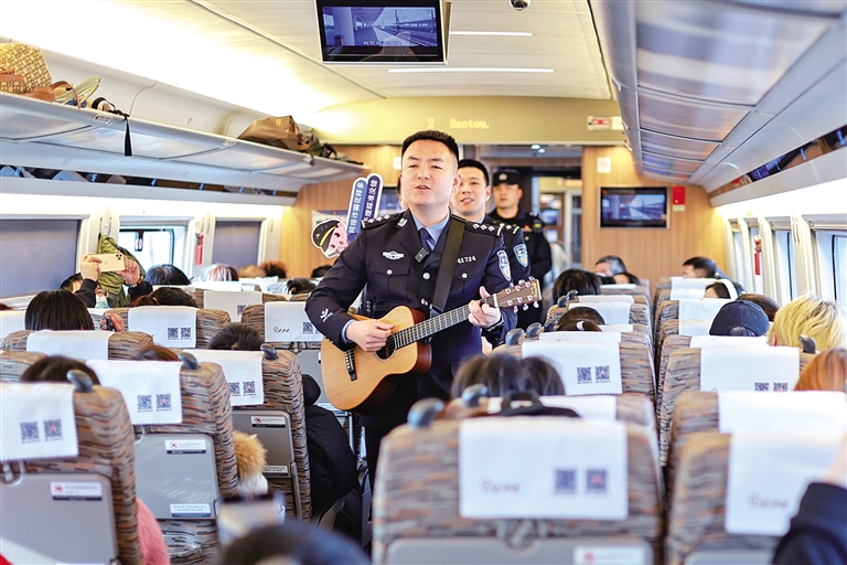 1月10日,民警通过演唱的方式向旅客开展普法宣传。当日,是第六个中国人民警察节,呼和浩特铁路公安局包头公安处组织民警在列车上开展“警心护旅途·平安伴你行”主题普法宣传活动,民警将反诈常识、铁路出行安全提示融入经典民谣,向旅客讲解虚假购票、投资理财诈骗等电信网络诈骗的常见类型,切实提升旅客的反诈意识,为旅客送上一份特殊的安全“大礼包”。本报记者 孟和朝鲁 摄