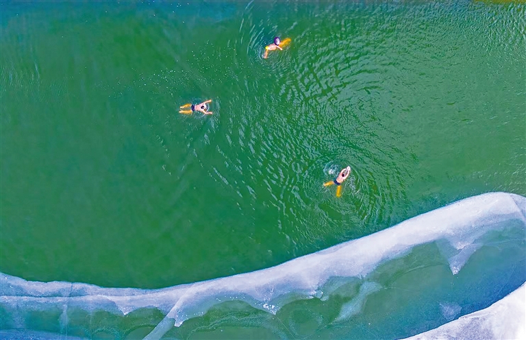 航拍镜头下,冬泳爱好者在包头市昆都仑河的寒波中自由畅游。他们对抗严寒、挑战自我,这份勇气与活力吸引了不少市民驻足观看,为他们加油鼓劲。李强 摄