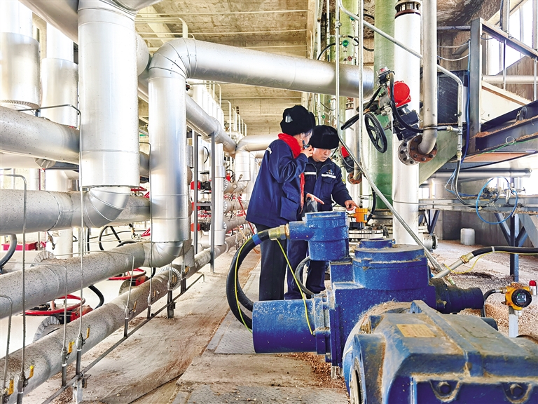 1月11日,在巴彦淖尔乌拉特前旗工业园区,中科化工有限公司员工正在查看设备运行情况。据了解,该企业将农村废弃玉米芯水解和精制后提取糠醛,年产2万吨,年产值约1.6亿元,年均上缴利税1600多万元,每年可为当地农牧民增收6000多万元,直接提供50余个就业岗位,间接带动200多人就业,为地方经济发展注入强劲动力。