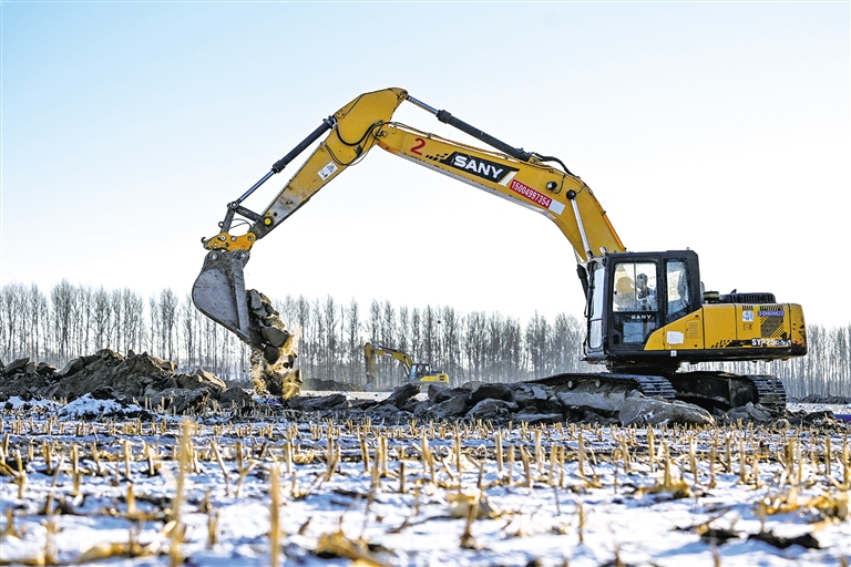 1月14日,在通辽市科左后旗常胜镇高标准农田建设现场,大型机械正在施工作业。近年来,内蒙古大力推进以高效节水为主的高标准农田建设,确保田、土、水、路、林、电、技、管“八配套”,亩均增粮10%以上,实现农业增效和农民增收。截至目前,全区累计建成高标准农田6281万亩。本报记者 孟和朝鲁 摄