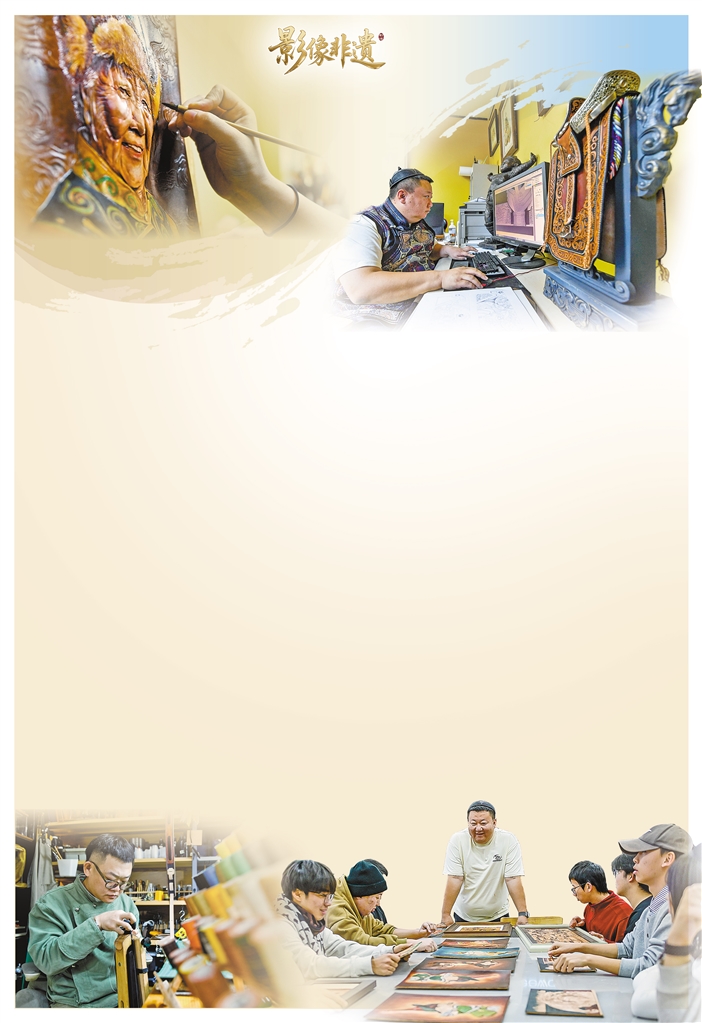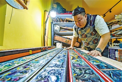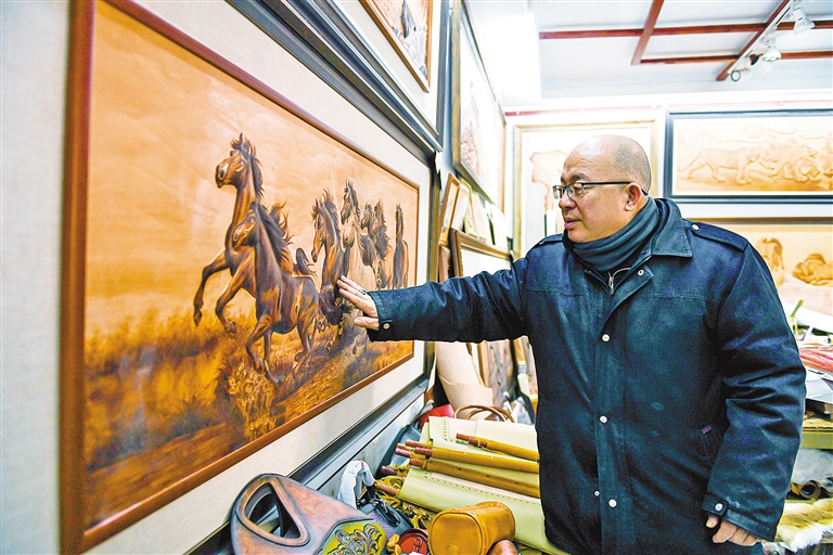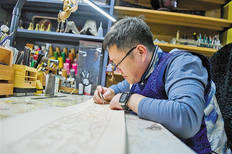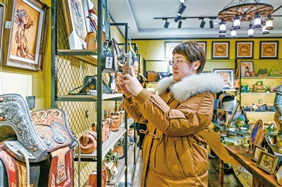 呼伦贝尔市海拉尔区呼伦贝尔古城内,有一家名为“塔日甘呼民族皮艺”的店。隆冬里的一个清晨,记者走进这家店的二楼,高级工艺美术师、内蒙古自治区工艺美术大师苏力德正在指导学生清珂尔给一幅鄂伦春族老人形象的皮雕画着色。