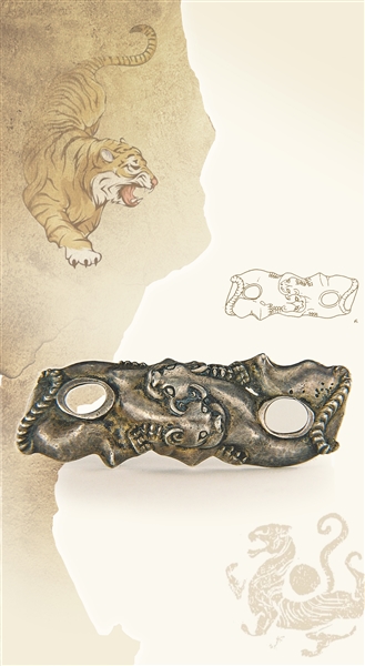 呼玫介绍:“双虎咬斗纹银饰件大多缝缀在衣服的衣襟、袖口、裤脚或靴筒等部位,图案布局和谐,风格独特,制作精美,是中国早期北方游牧部族的艺术珍品。”