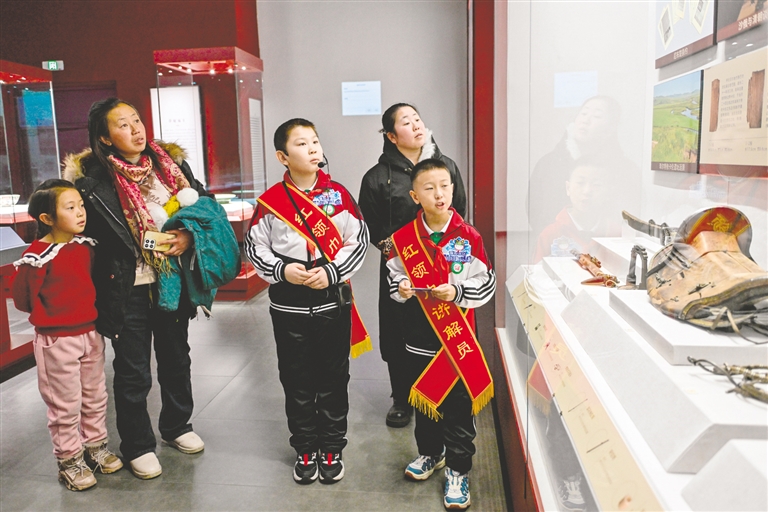 1月19日,呼伦贝尔市海拉尔区新海小学的“红领巾讲解员”在呼伦贝尔市历史博物馆内向游客市民提供讲解服务。为深化课外实践教育,传承历史文化,推广国家通用语言文字,当地组织中小学生开展红领巾志愿服务活动,让他们走进博物馆、纪念馆和社区等场所,利用寒假期间,以青少年视角传递家乡底蕴,助力游客市民读懂历史,让孩子们在实践中不断增强文化自信,度过快乐而有意义的假期。 本报记者 王晓博 摄
