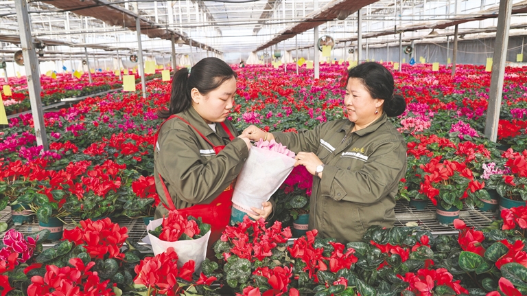 1月23日,工作人员正忙着打包花卉。通辽市庆云农业科技有限公司花卉种植基地内,5万盆精品大规格仙客来迎来盛花期,不仅吸引了市民和游客前来打卡观赏,还将在新春佳节到来之际,销往东北、华北等周边地区的花卉市场。本报记者 鲍庆胜 摄