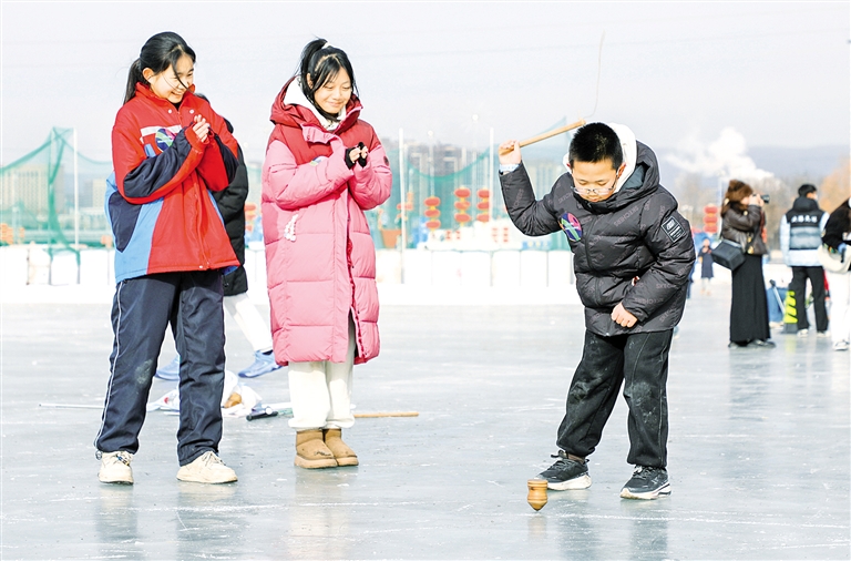 1月27日,一名青少年正在抽冰尜。当日,2025—2026呼和浩特青少年冰雪运动会在东河冰雪场启幕,吸引了来自呼和浩特市多所学校及青少年体育社会组织的400余名青少年参赛。运动会按年龄划分小学组、初中组、高中组和青少年体育社会组织组,设置冰车接力赛、射门大比拼、雪地竞速等项目,让不同年龄段的青少年都能尽情畅享冰雪运动的乐趣。本报记者 孟和朝鲁 摄