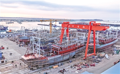 1月28日,在山东省荣成市石岛管理区海工装备产业基地,船舶在维修中(无人机照片)。临近月末,各地企业铆足干劲赶订单、忙生产,力争新年首月“开门红”。