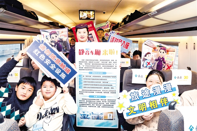 2月1日,中国铁路上海局集团有限公司合肥客运段在G54次列车上进行“静音车厢”宣介活动。自2月1日起,高铁“静音车厢”服务将拓展至除动卧列车之外的“D”字头、“G”字头部分列车,全国铁路提供“静音车厢”服务的列车将超8000列。 新华社记者 杜宇 摄