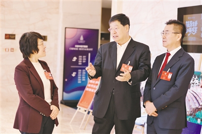 2月5日,通辽市代表团毛光辉(左)代表建议,结合“十五五”规划,主动谋划开展关于能源发展重大问题的研究,更好地统筹发展与安全、保护与开发。本报记者 王晓博 摄