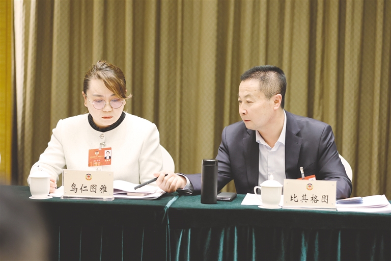 2月5日下午,自治区政协委员比其格图(右)与自治区政协委员乌仁图雅探讨如何推动内蒙古农畜产品走向大市场、提升核心竞争力。 本报记者 贾奕村 摄