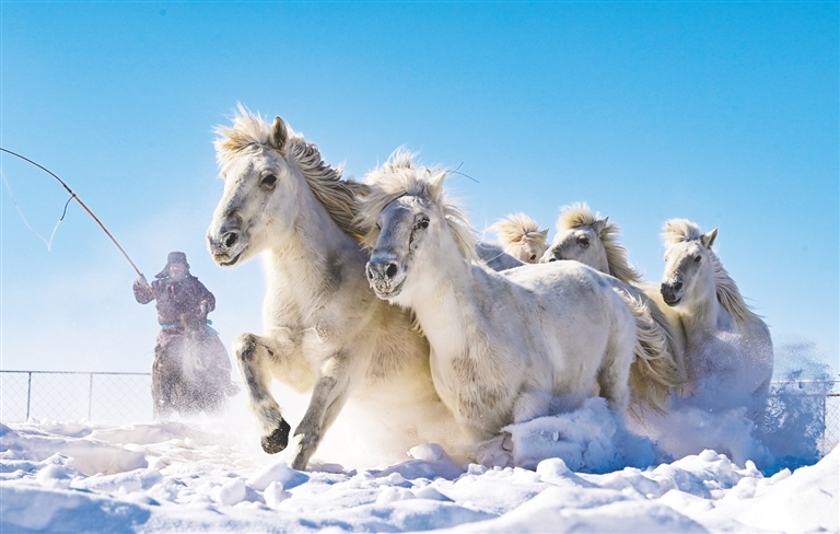 2月5日,牧民在凤凰马场的雪原上驯马。2月5日,位于内蒙古自治区锡林郭勒盟锡林浩特市的凤凰马场举办“策马踏雪迎新春”主题活动,当地牧民在雪原上驯马,呈现雪原奔马壮观景象,喜迎马年春节。