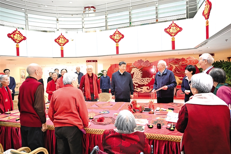 在银龄老年公寓,习近平详细了解老年人健康检查、康复训练、日常起居照料等情况。大厅里,一些老人正在写春联和福字,习近平来到他们中间,欣赏他们的创作,勉励他们老骥伏枥、老有所为,祝他们健康长寿、春节快乐。