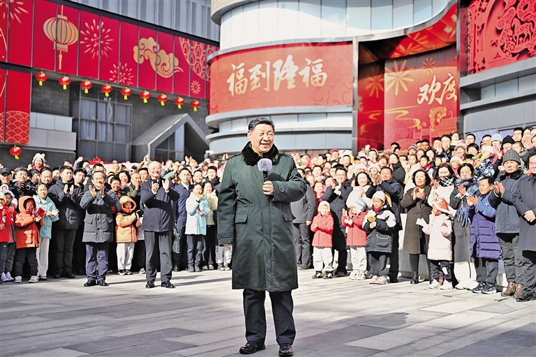 正值农历小年,隆福大厦前,新春市集吸引了大量市民和游客。习近平饶有兴致察看各式年货摊位,同现场群众亲切交流。他愉快地向大家讲起年少时多次到隆福寺的情景,还购买了几份特色食品和文创产品。