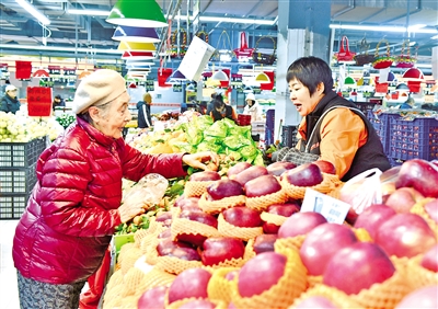 2月12日,呼和浩特市赛罕区亿隆生鲜超市内市民正在采买果蔬等年货。连日来,首府持续强化食品安全和价格监管,确保春节期间货足价稳。本报记者 刘燕杰 摄