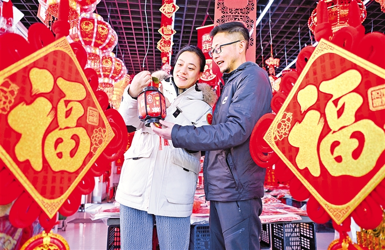 2月11日,呼和浩特市民在保全庄农贸市场选购春联、福字等节庆饰品。随着春节临近,呼和浩特市各大超市、沿街商铺纷纷开设春联专区,象征着吉祥与团圆的春联、福字、年画等年货商品琳琅满目,市民根据各自喜好选购不同款式,年货市场红火热闹,处处洋溢着喜庆祥和的节日氛围。本报记者 孟和朝鲁 摄