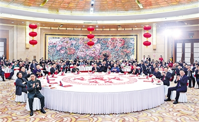 新城宾馆国宴厅内张灯结彩,与会各界人士互致问候、祝福新春,现场洋溢着欢乐喜庆的节日气氛。