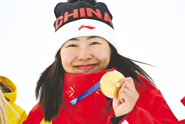 2月18日,中国选手徐梦桃在颁奖仪式上。当地时间2月18日,在意大利利维尼奥举行的米兰-科尔蒂纳冬奥会自由式滑雪女子空中技巧决赛中,中国选手徐梦桃获得冠军,队友邵琪和孔凡钰分获三、四名。 新华社记者 张宏祥 摄