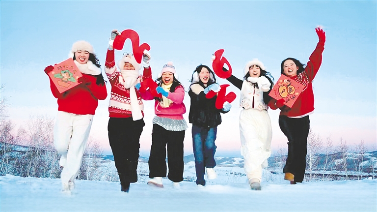 2月18日,在呼伦贝尔市额尔古纳市恩和俄罗斯民族乡,来自深圳的游客在村边白雪皑皑的山坡上,手持“2026”艺术字与“福”字欢呼跳跃,定格新春喜悦。正值当地“我在恩和过大年·中俄风情团圆季”活动火热进行,写双语春联、包俄式饺子、列巴烘焙等特色活动,吸引大批游客前来体验。