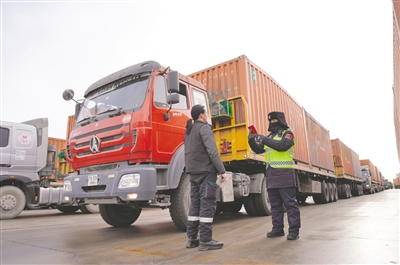 春节假期,甘其毛都边检站优化服务举措,积极应对节日期间口岸出入境客流、物流高峰,全力保障春节期间口岸安全、高效、顺畅通关。图为边检站民警正在核验出入境司机证件。本报记者 孟和朝鲁 摄