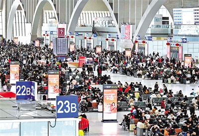 2月23日,旅客在河北石家庄火车站候车大厅候车。记者从中国国家铁路集团有限公司获悉,2月23日正月初七是春节假期最后一天,全国铁路迎来返程客流最高峰,预计发送旅客1850万人次,计划加开旅客列车2297列。新华社发