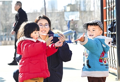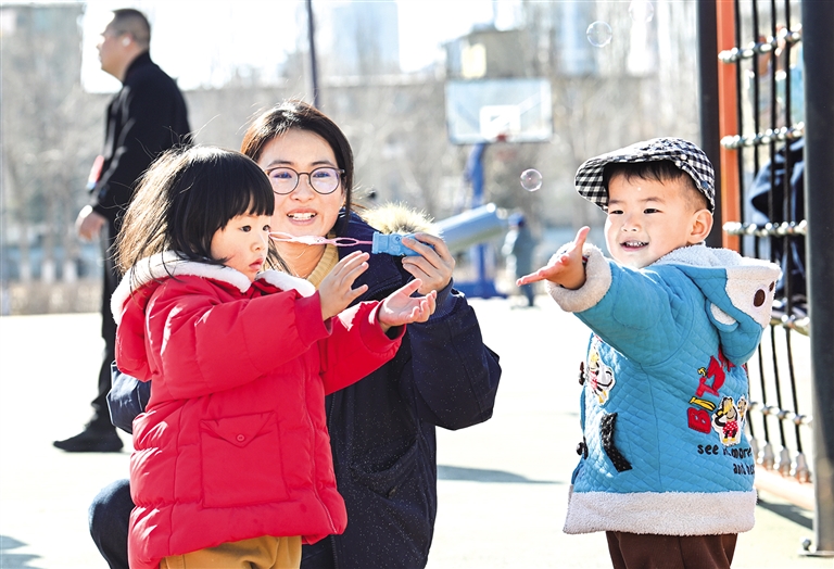 2月24日,呼和浩特市民在万和体育公园内游玩。连日来,呼和浩特气温回升,处处洋溢着轻松温馨的春日气息,不少市民带着孩子来到户外奔跑嬉戏,在明媚春光里享受户外运动的快乐。本报记者 孟和朝鲁 摄