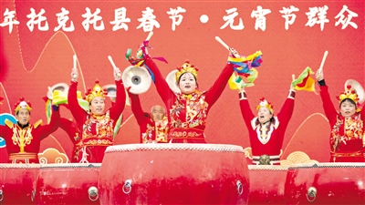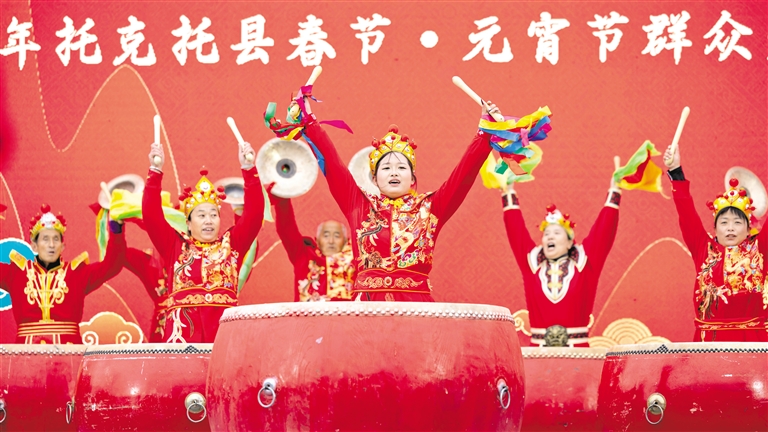 3月3日,农历正月十五,呼和浩特市托克托县新营子镇黑水泉村民正在表演自治区级非遗项目“寿阳鼓”。当日,托克托县云中文化宫人声鼎沸、热闹非凡,2026年元宵节社火表演活动在此精彩上演。本报记者 郑学良 摄