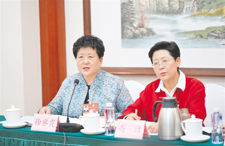 3月5日,住内蒙古全国政协委员徐睿霞(左)建议,设立乌梁素海生态保护与系统治理专项基金,开展跨学科联合攻关,重点研发低成本、生态友好的底泥污染治理与资源化利用技术。本报记者 王鹏 摄