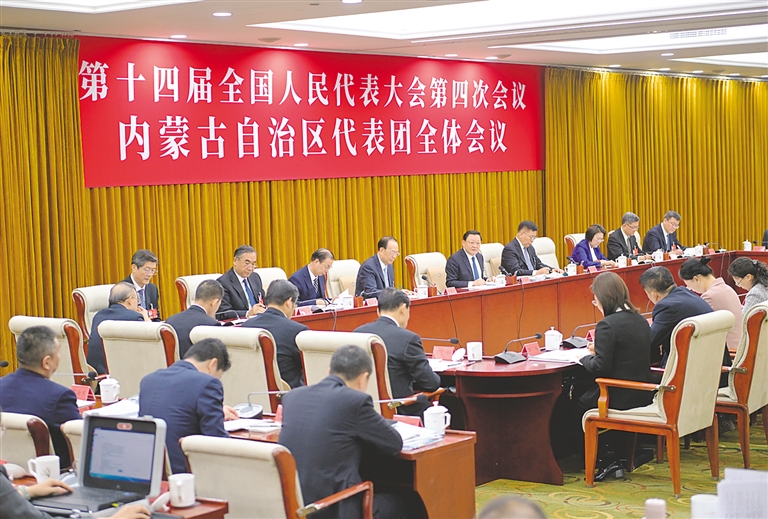 三月六日上午,十四届全国人大四次会议内蒙古代表团在驻地举行全体会议,审查“十五五”规划纲要草案。本报记者 马建兵 摄