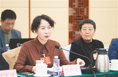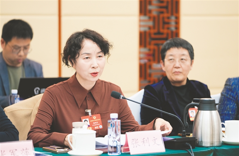3月7日,全国政协委员张利文(左)建议,以国家级零碳园区为引领,深化绿电直连改革,打造新型电力系统先行示范区,着力推动能源强国建设。本报记者 王鹏 摄