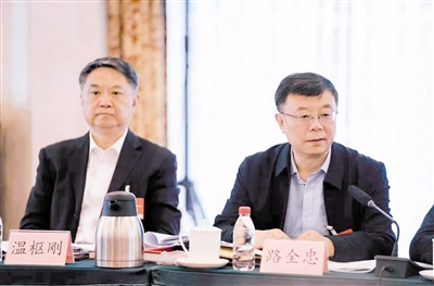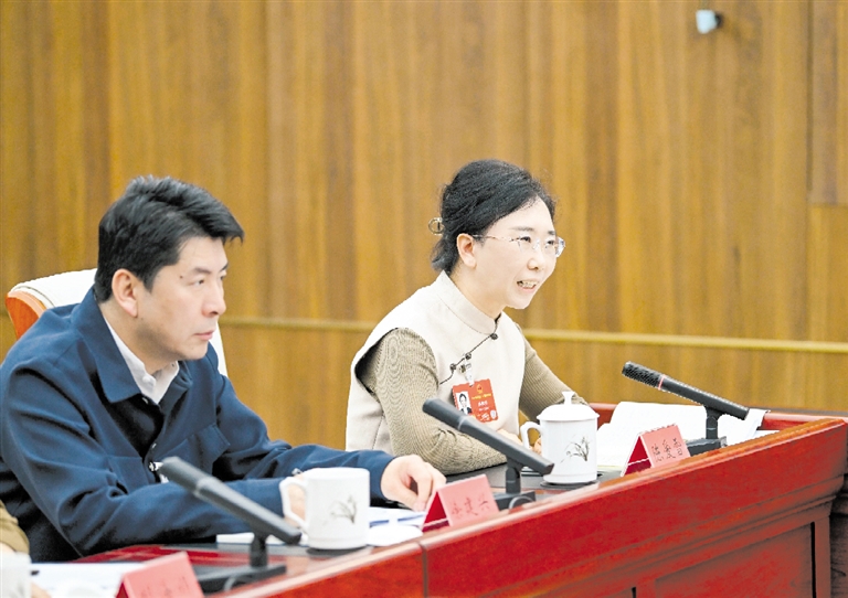 3月8日,全国政协委员路全忠(右)就扎实推进“三北”工程攻坚战、完善多元化生态补偿机制等重点任务积极建言献策。本报记者 王鹏 摄