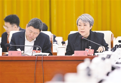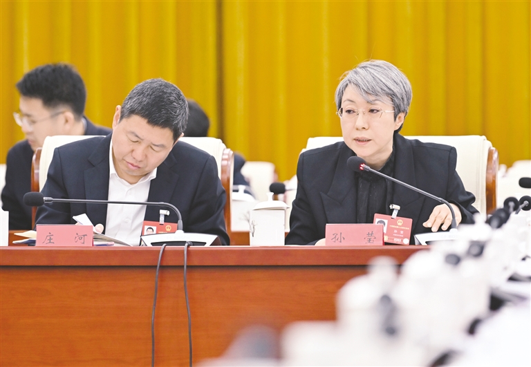 3月9日,全国人大代表孙莹(右)建议,加快推进针对物业管理领域的立法。 本报记者 马建兵 摄