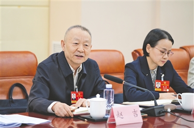 3月9日,全国政协常委赵吉(左)建议,加强“沙戈荒”新能源基地建设,在创新指标中增加绿色算力指标。 本报记者 王鹏 摄