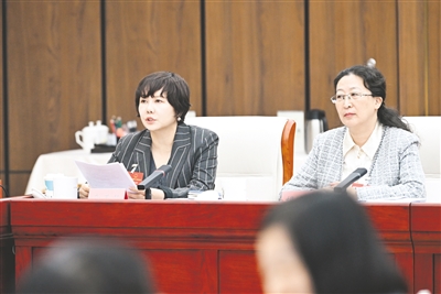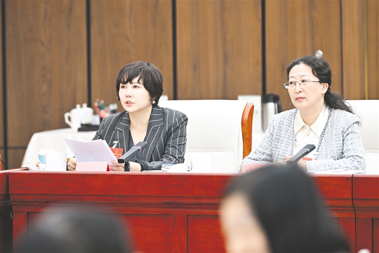 | 3月11日,全国人大代表奇玉琴(左)建议,强化知识产权协同保护,建立常态化联络机制,对重大知识产权案件联合研判、快速维权,形成行政和司法高效保护合力。本报记者 孟和朝鲁 摄 |