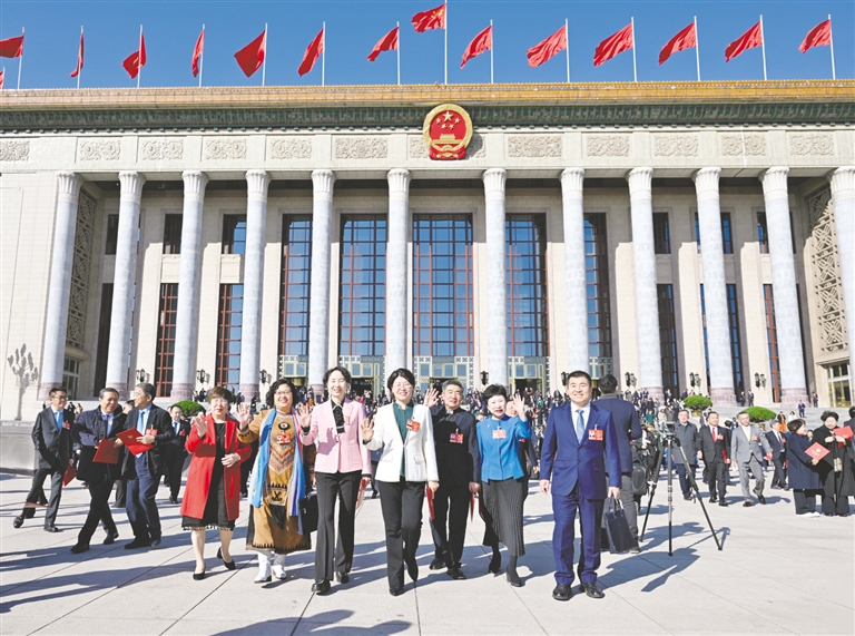 | 3月11日上午,全国政协十四届四次会议在北京闭幕。部分住内蒙古全国政协委员走出会场。本报记者 韩卿立 摄 |