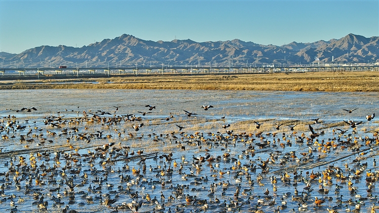 在鄂尔多斯市达拉特旗沿黄岸线的黄河湿地,春季迁徙候鸟大天鹅、灰鹤、赤麻鸭等陆续翩跹而至,它们或在水面游弋采食,或伸展脖颈梳理羽毛,为湿地增添了无限活力与诗意。
