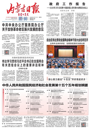 会议指出,习近平总书记在全国两会有关团组会议上的重要讲话,围绕抓好“十五五”经济社会发展、建设健康中国、推进国防和军队现代化等作出深刻阐述,为我们做好相关工作提供了重要遵循。各级要把习近平总书记重要讲话精神同习近平总书记对内蒙古系列重要讲话重要指示精神结合起来一体学习贯彻,聚焦聚力落实自治区党委“1571”工作部署,在研究新情况解决新问题上下功夫、求实效,扎实推动高质量发展取得新成效。要坚持教育科技人才一体发展,瞄准新能源、现代煤化工、稀土新材料、生物制造、草业乳业等特色优势产业和发展急需领域加强科技攻关,改造提升传统产业,培育壮大新兴产业,谋划布局未来产业,因地制宜发展新质生产力。要牢牢稳住农牧业和传统能源产业基本盘,提速提效推进新能源建设,加强稀土等战略资源开发利用,提升产业链供应链韧性和安全水平,扩大全方位对外开放,更好融入国内国际双循环。要用心用情推进“十大民生工程”,更好满足群众在就业、教育、医疗、住房、养老、托幼等方面的迫切需求,努力增进民生福祉,■下转第2版 ■上接第1版 促进共同富裕。要一以贯之全面从严治党,精心组织开展树立和践行正确政绩观学习教育,驰而不息正风肃纪反腐,持续营造风清气正的政治生态。要深化医药卫生领域改革,健全公共卫生体系,建设优质高效医疗服务体系,加快提升医疗服务水平,倡导健康文明生活方式,不断满足群众日益增长的多元化卫生健康需求。要把新时代政治建军方略落实到党管武装、支持国防和部队建设各项工作中,深入了解驻区部队实际需求,尽心尽力做好服务保障。