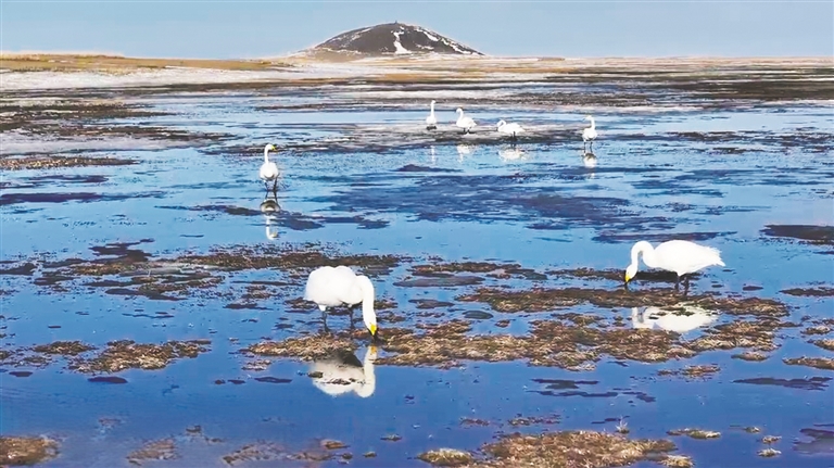 清明时节,在鄂温克族自治旗境内的辉河国家级自然保护区,7只白天鹅在清澈水面优雅游弋,为草原湿地增添灵动生机。本报记者 李新军 摄