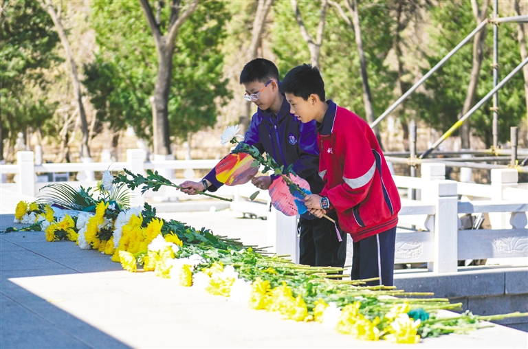 4月5日,两名中学生在呼和浩特市青城公园人民英雄纪念碑广场文明共祭点位敬献鲜花。当日,呼和浩特市各族群众自发前往首府各处文明共祭点位,缅怀革命先烈、寄托对先人的哀思。清明节期间,呼和浩特市民政局启动祭扫服务保障工作,在市四区及所属旗县设立149个祭扫点位,满足市民祭扫需求。本报记者 王磊 摄