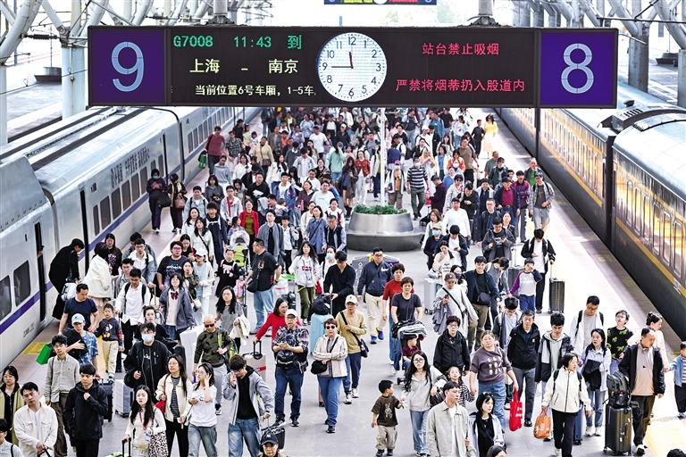 这是4月6日在南京火车站站台拍摄的旅客客流。记者从中国国家铁路集团有限公司获悉,4月6日,全国铁路迎来假期返程客流高峰,预计发送旅客2080万人次,计划加开旅客列车1369列。4月5日,全国铁路发送旅客1475.6万人次,运输安全平稳有序。 新华社发