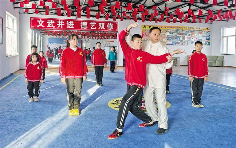 清晨,科左后旗东方文武学校演武厅内,57岁的刘世君身着练功服,身姿挺拔如松,正领着学生们修习武当自然派八卦掌。穿掌、迈步、旋身……每一个动作都沉稳有力,动静相融间,刚柔并济的武学韵味尽显无遗。