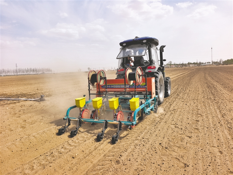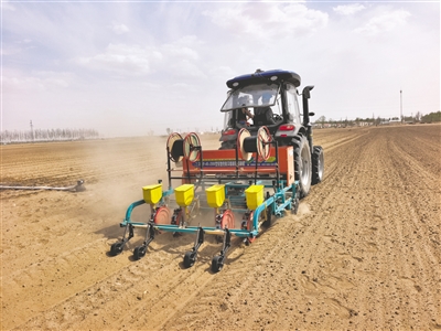 4月13日,在巴彦淖尔市磴口县沙金套海苏木温都尔毛道嘎查广袤的田野上,一台北斗导航玉米播种机正在按照导航线路均匀地播种玉米,标志着河套地区玉米种植作业从西向东正式拉开序幕。本报记者 图古斯毕力格 摄