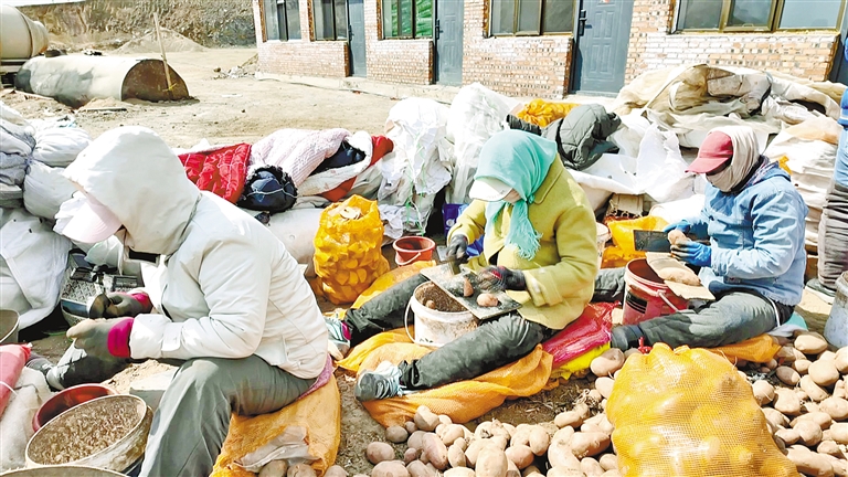 与此同时,朝阳镇民乐村的马铃薯备耕工作也在同步推进。村民们趁着晴好天气加快薯种处理,熟练进行种薯筛选、切块、拌种等工序。村民张万瑞蹲在地上,手里拿着刀,正在切薯块:“这活儿看着简单,其实有讲究,切得太大浪费种子,切得太小出苗不齐。”他边说边示范,刀起刀落,薯块大小几乎一模一样。