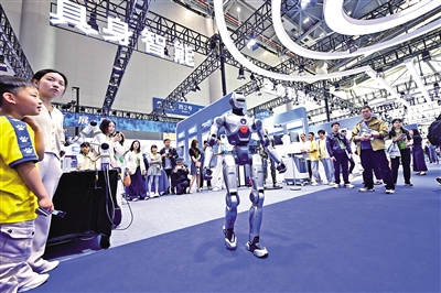 4月26日,观众在第四届中国(安徽)科技创新成果转化交易会上观看一款人形机器人。4月26日至28日,第四届中国(安徽)科技创新成果转化交易会在合肥举行。本届科交会以“科技打头阵 创新赢未来”为主题,展示我国多个领域科技创新的最新成果。 新华社记者 周牧 摄